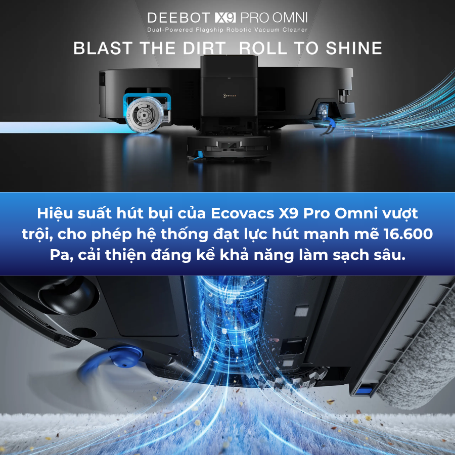 Đầu tiên, Robot hút bụi lau nhà Ecovacs X9 Pro Omni sở hữu công nghệ độc quyền BLAST (Boosted Large-Airflow Suction Technology). Theo như các chuyên gia hàng đầu, BLAST được đánh giá là cuộc cách mạng trong công nghệ hút bụi, tái định nghĩa hiệu quả làm sạch bằng cách tối ưu luồng khí thay vì chỉ tập trung vào lực hút thông thường. Nhờ thiết kế khí động học cải tiến kết hợp với pin túi EV-Grade đầu tiên trong ngành, có dung lượng lên đến 6400 mAh và tuổi thọ cao gấp 2,4 lần, BLAST tạo ra lưu lượng luồng khí lên đến 16,3 lít/giây — cao hơn 49% so với các hệ thống thông thường.