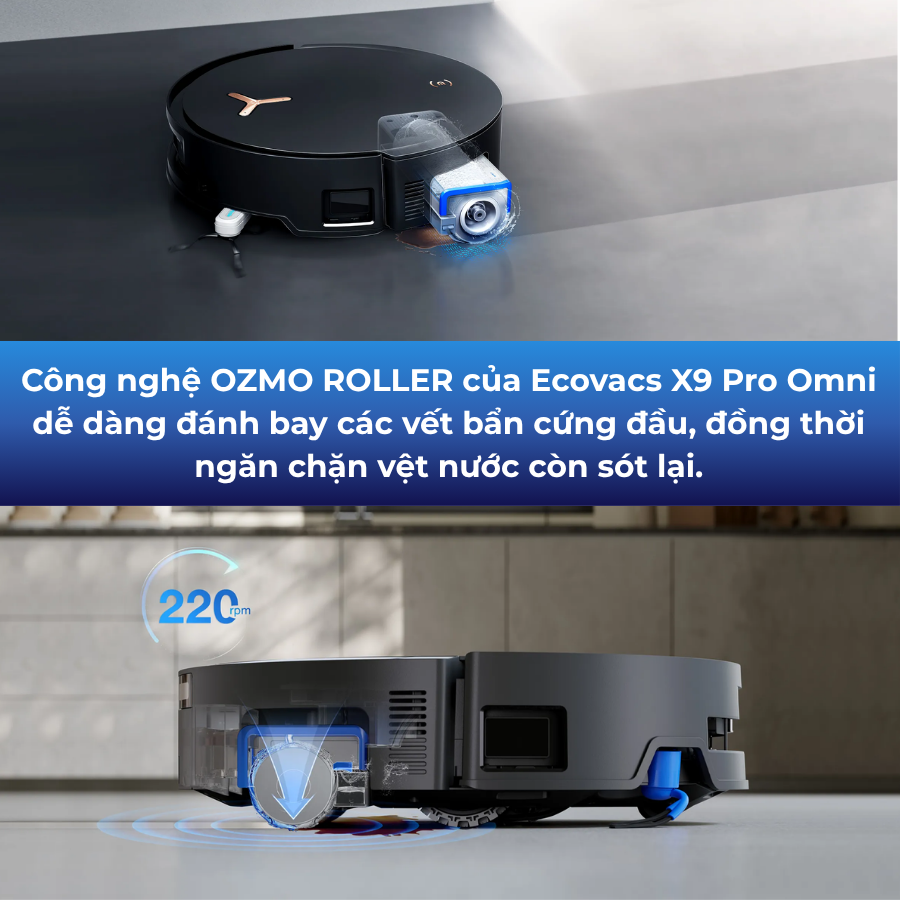 Bên cạnh đó, với tốc độ quay lên đến 220 vòng/phút, tương đương 220 lần chà rửa tốc độ cao mỗi phút, công nghệ OZMO ROLLER của Ecovacs X9 Pro Omni dễ dàng đánh bay các vết bẩn cứng đầu, đồng thời ngăn chặn vệt nước còn sót lại. Thiết kế cây lau của Ecovacs X9 Pro Omni với diện tích tiếp xúc nhỏ nhưng áp lực tập trung, giúp tăng khả năng làm sạch tại các điểm bẩn cứng đầu. Ecovacs X9 Pro Omni đảm bảo sàn nhà luôn sáng bóng, và được làm sạch sâu mỗi ngày.