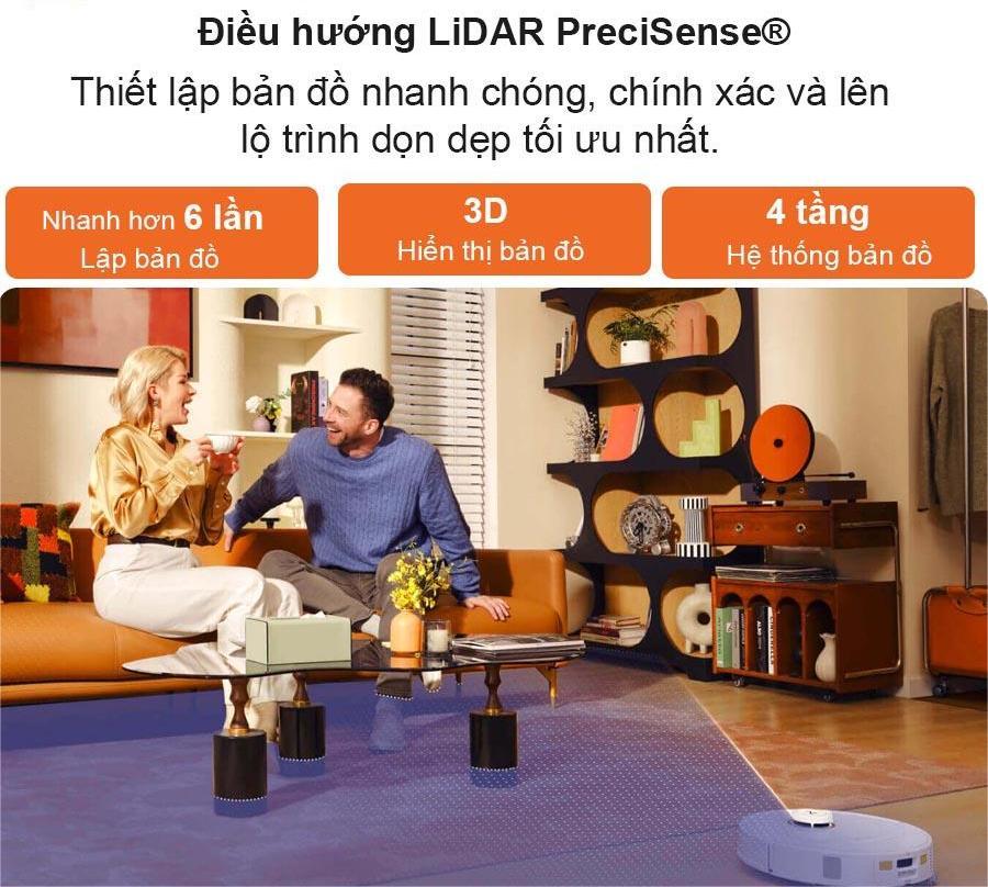 Công nghệ điều hướng LiDAR PreciSense® cho phép robot tạo bản đồ chi tiết và chính xác của ngôi nhà, lên kế hoạch làm sạch tối ưu và tránh các khu vực dễ mắc kẹt. Robot cũng hỗ trợ lưu trữ bản đồ cho nhiều tầng, thuận tiện cho nhà nhiều tầng.