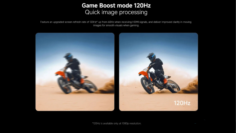 Dành riêng cho game thủ, Tivi Xiaomi A Pro QLED 4K 43 inch 2026 được trang bị chế độ Game Boost 120Hz. Khi kết nối máy chơi game thông qua cổng HDMI ở độ phân giải Full HD, tivi sẽ tự động nâng tần số quét, giúp cảnh game mượt mà gấp đôi, không bị giật hình, phản hồi siêu nhanh.