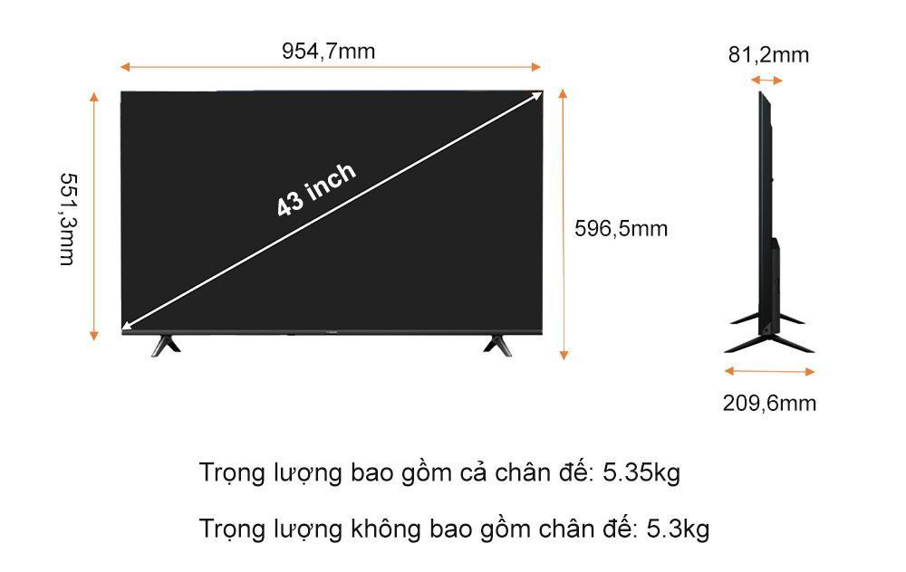 | Kích thước có chân đế | 954.7 × 209.6 × 596.5mm |