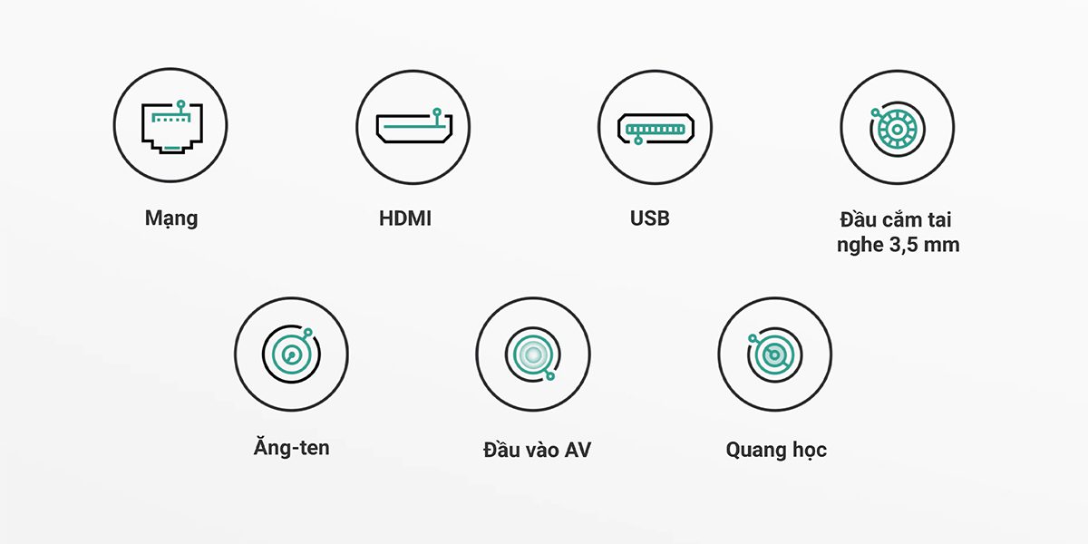 Hỗ trợ nhiều cổng kết nối như HDMI, USB, đầu cắm tai nghe 3.5mm, ăng-ten, đầu vào AV, và quang học, giúp kết nối với nhiều thiết bị khác nhau.