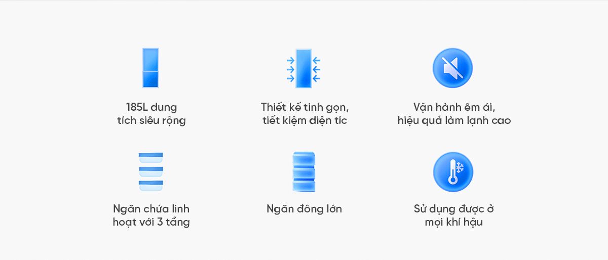 Dung tích tổng 185L (ngăn mát: 127L, ngăn đông: 58L)