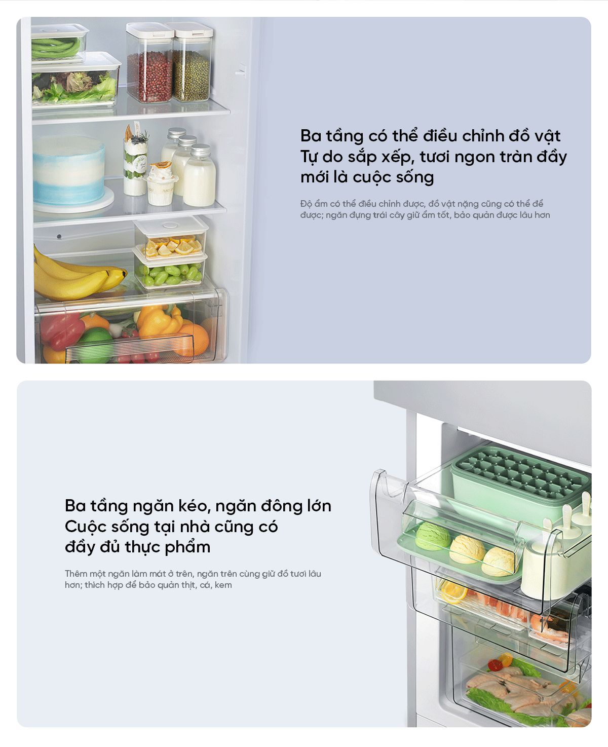 Sự linh hoạt trong thiết kế nội thất bên trong cũng là điểm cộng của Tủ lạnh Xiaomi 2 cánh 185L, khi mỗi ngăn đều có đến 3 kệ có thể điều chỉnh độ cao tùy ý. Điều này giúp bạn dễ dàng sắp xếp và bảo quản mọi loại thực phẩm với kích thước khác nhau, từ các hộp đựng lớn, chai lọ cao đến những thực phẩm tươi sống nhỏ gọn.