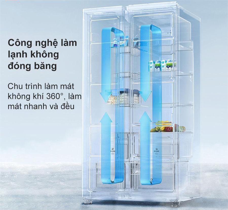Tủ lạnh Xiaomi 2 cánh 610L được trang bị công nghệ làm lạnh bằng không khí hiện đại, giúp hơi lạnh lan tỏa đồng đều khắp các ngăn chứa thông qua hệ thống tuần hoàn khí thông minh. Nhờ đó, thực phẩm luôn được làm lạnh hiệu quả mà không bị đóng tuyết – người dùng không cần phải xả tuyết thủ công như ở các dòng tủ lạnh truyền thống.