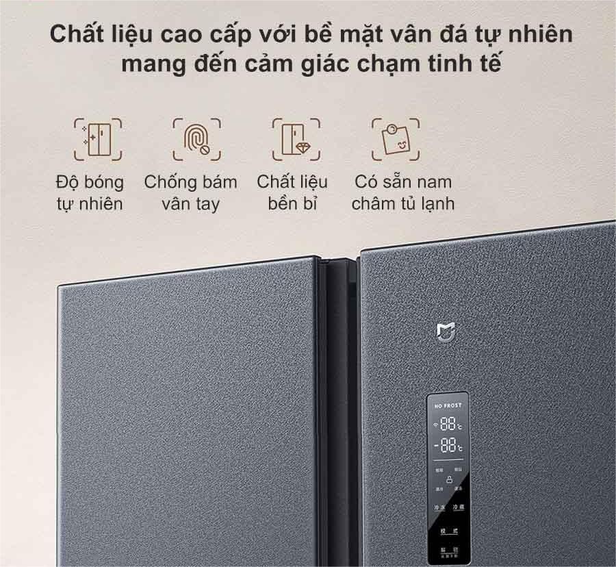 Tủ lạnh Xiaomi 2 cánh 610L không chỉ gây ấn tượng bởi dung tích lưu trữ lớn và công nghệ bảo quản hiện đại, mà còn nổi bật với thiết kế sang trọng được chăm chút đến từng chi tiết. Sản phẩm sử dụng tấm vân đá thô Moyu Rock – một loại chất liệu cao cấp kết hợp cùng công nghệ carbon ion nóng chảy tiên tiến và vật liệu thân cửa gồm 9 lớp đánh bóng tinh xảo.