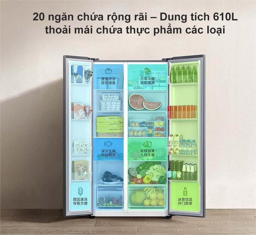 Tủ lạnh Xiaomi 2 cánh 610L sở hữu dung tích cực lớn lên tới 610L, trong đó bao gồm 383L cho ngăn mát và 227L cho ngăn đông – hoàn toàn đáp ứng nhu cầu bảo quản thực phẩm cho các gia đình đông người hoặc hộ kinh doanh nhỏ. Đặc biệt, tủ được trang bị tới 20 ngăn chứa tiện dụng, mang lại không gian lưu trữ đa dạng và linh hoạt.