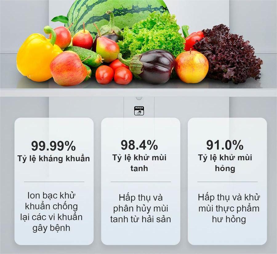 Tủ lạnh Xiaomi 4 cánh 430L được trang bị mô-đun kháng khuẩn tiên tiến bằng ion bạc, có khả năng tiêu diệt đến 99,99% vi khuẩn gây hại, đồng thời mang lại hiệu quả khử mùi vượt trội. Cụ thể, tủ lạnh có thể loại bỏ tới 98,4% mùi trimethylamine và 91% mùi methyl mercaptan – hai loại mùi khó chịu thường xuất hiện trong thực phẩm.