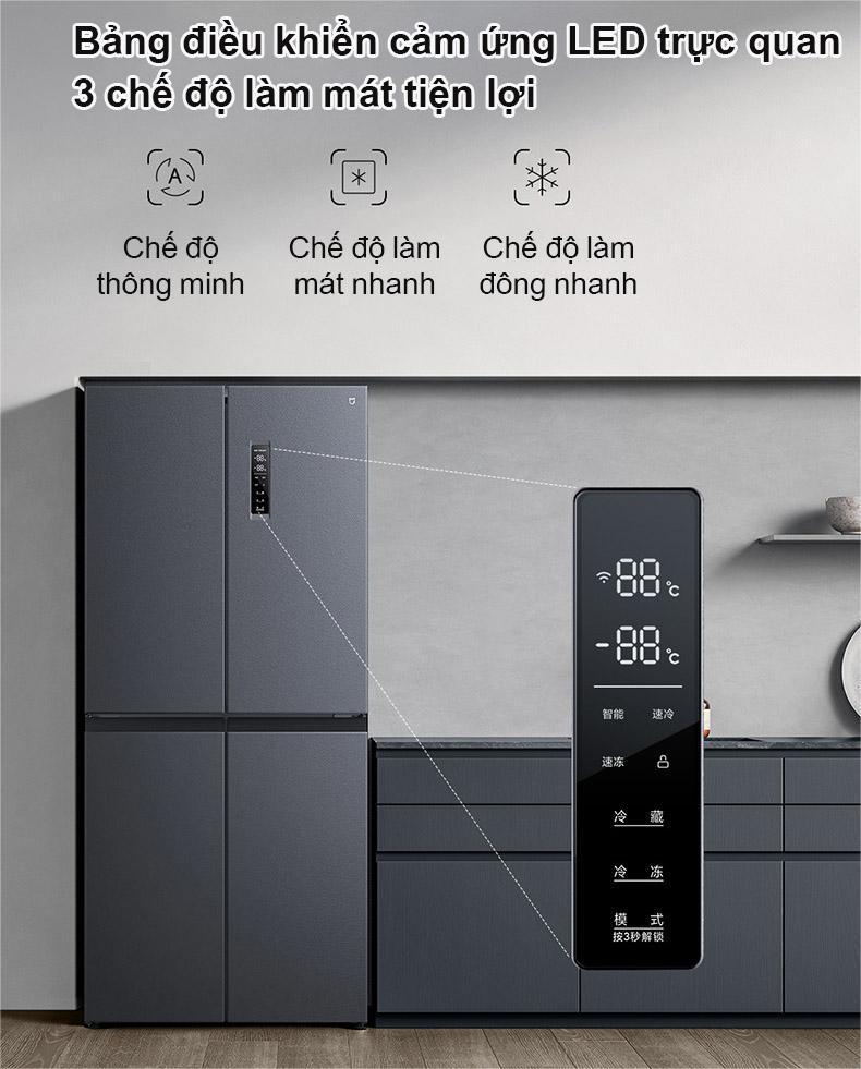 Bảng điều khiển cảm ứng LED được tích hợp ngay trên cánh tủ với 3 chế độ làm lạnh tiện lợi: Thông minh – Làm lạnh nhanh – Làm đông nhanh.