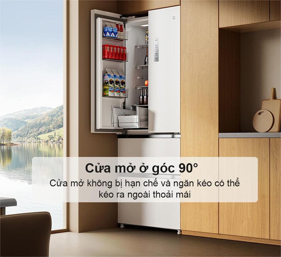 Nhờ thiết kế bản lề chìm thông minh, Tủ lạnh Xiaomi 4 cánh 439L cho phép bạn đặt tủ sát tường mà vẫn dễ dàng mở cửa tới góc 90°, khắc phục hoàn toàn nhược điểm thường thấy ở các dòng tủ lạnh truyền thống. Với khả năng mở rộng linh hoạt như vậy, người dùng có thể thuận tiện kéo mở các ngăn kéo, thao tác sắp xếp hay lấy thực phẩm một cách dễ dàng, không gặp cản trở bởi khoảng cách tường sát bên.