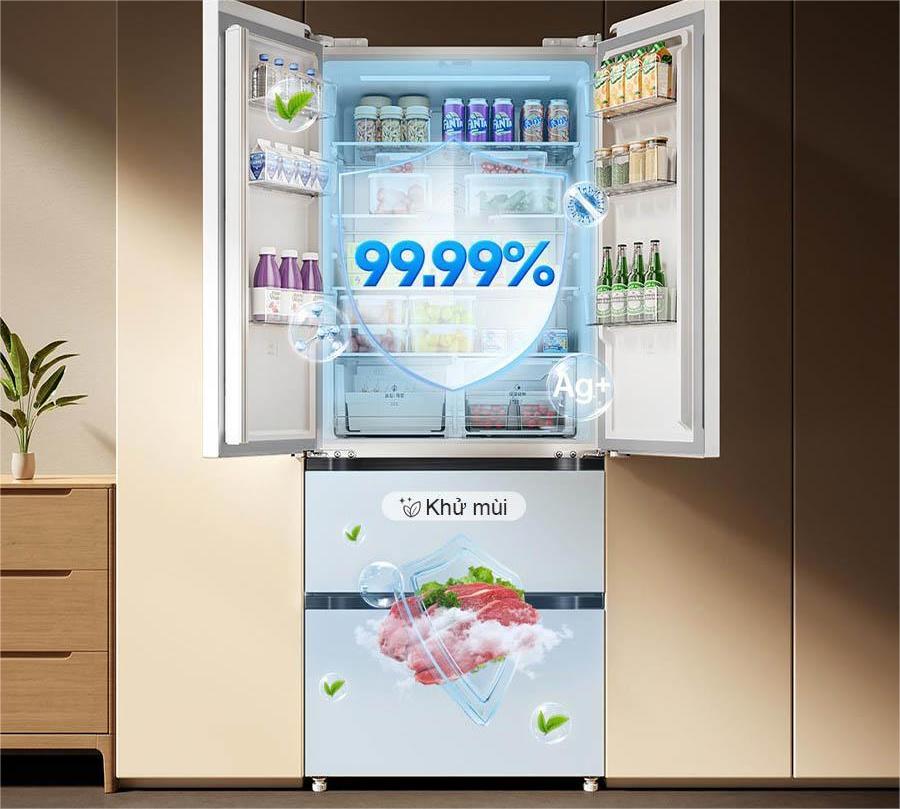 Được trang bị mô-đun ion bạc khử mùi và kháng khuẩn hiện đại, tủ lạnh Xiaomi 4 cánh 439L có khả năng loại bỏ đến 99,99% vi khuẩn gây hại như E. coli và loại bỏ 98,1% mùi tanh khó chịu (trimethylamine). Công nghệ này không chỉ giúp ngăn ngừa việc thực phẩm bị ám mùi lẫn nhau mà còn tạo ra một môi trường lưu trữ trong lành, đảm bảo bảo quản thực phẩm luôn tươi ngon, an toàn và giữ trọn hương vị tự nhiên cho cả gia đình bạn.