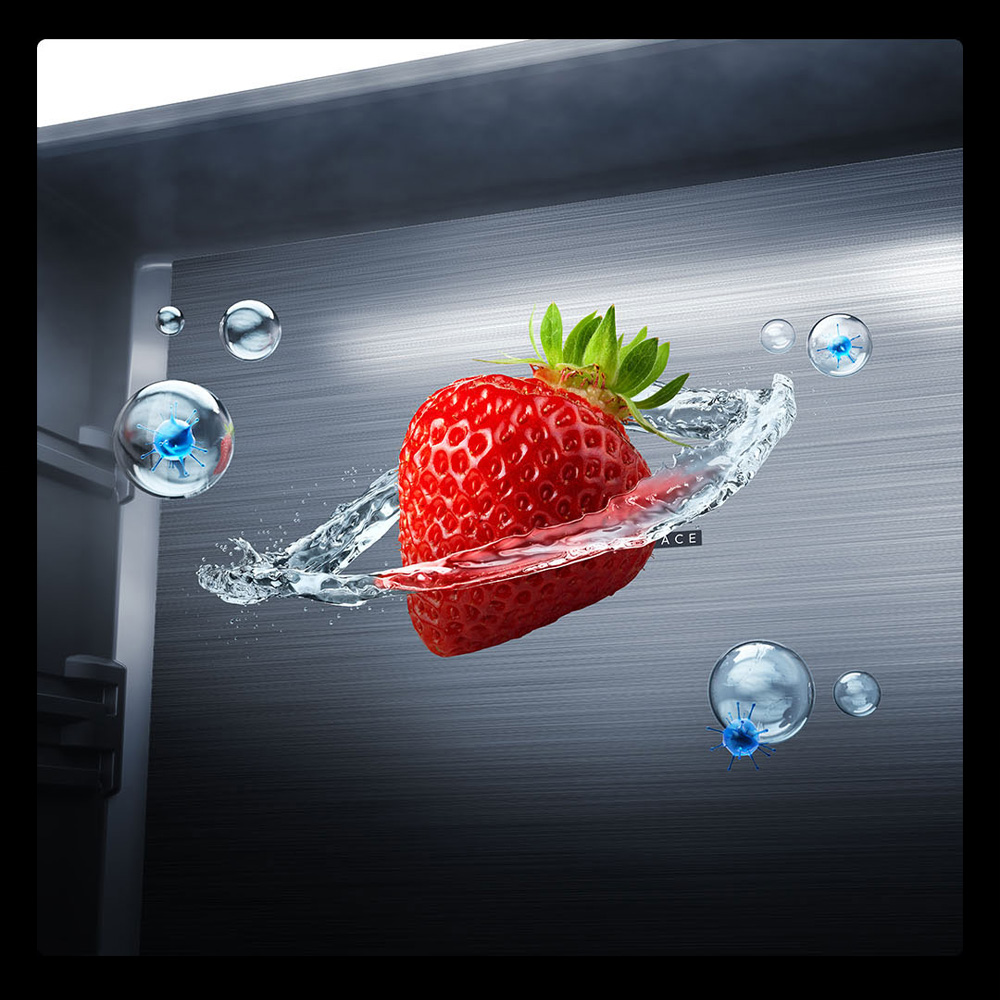 Khả năng khử trùng bằng ion âm là điểm nổi bật giúp loại bỏ đến 99,9% vi khuẩn gây hại bên trong tủ. Đồng thời, công nghệ này còn loại bỏ mùi hôi từ thực phẩm sống, hạn chế khí ethylene – nguyên nhân làm rau củ nhanh héo – giúp không gian bảo quản luôn sạch sẽ, thực phẩm giữ được chất lượng và độ tươi ngon lâu hơn.