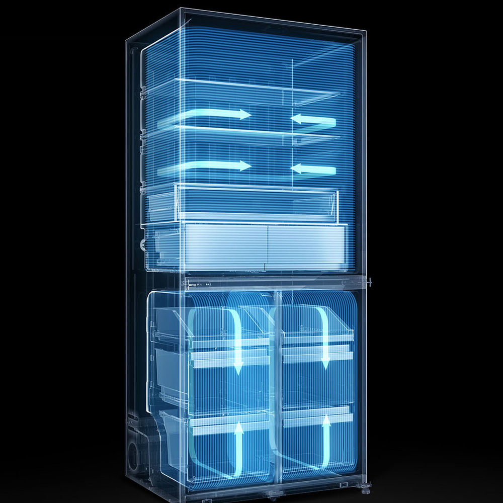 Tủ lạnh Xiaomi 4 cánh 603L được trang bị công nghệ làm lạnh 360 độ giúp luồng khí lạnh phân bổ đều khắp các ngăn, duy trì nhiệt độ ổn định và bảo quản thực phẩm tối ưu. Nhờ khả năng làm lạnh không đóng tuyết, thực phẩm luôn giữ được độ tươi ngon, không bị đóng đá hay dính vào nhau, dễ dàng lấy ra sử dụng bất cứ lúc nào mà không cần rã đông.