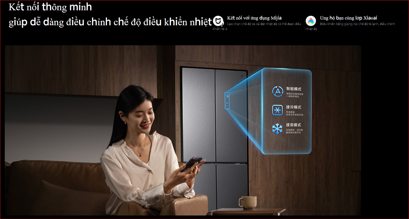 Tủ lạnh Xiaomi 4 cánh 603L hỗ trợ kết nối với ứng dụng Mijia, cho phép người dùng dễ dàng theo dõi và điều chỉnh nhiệt độ từng khoang tủ từ xa thông qua điện thoại thông minh. Dù đang ở văn phòng hay trong một chuyến du lịch dài ngày, bạn vẫn có thể kiểm soát hoạt động của tủ một cách linh hoạt và chính xác.