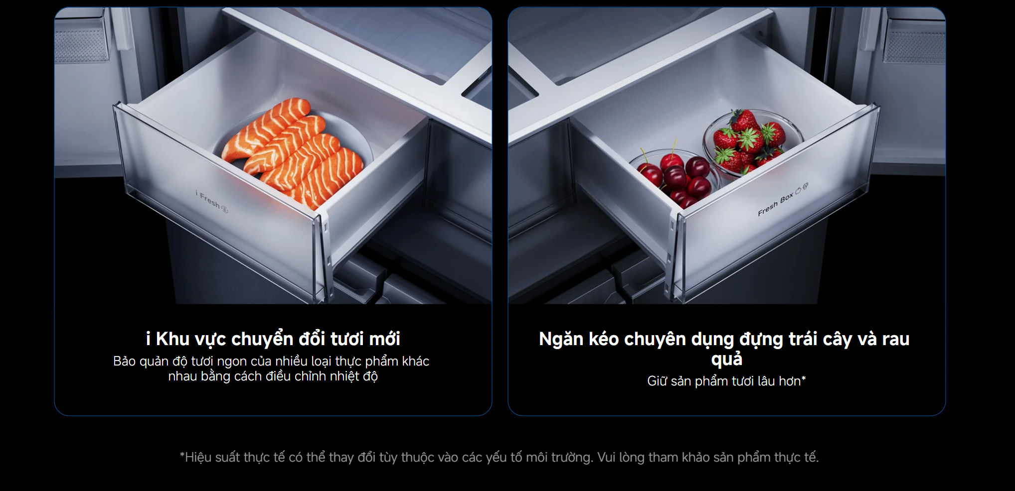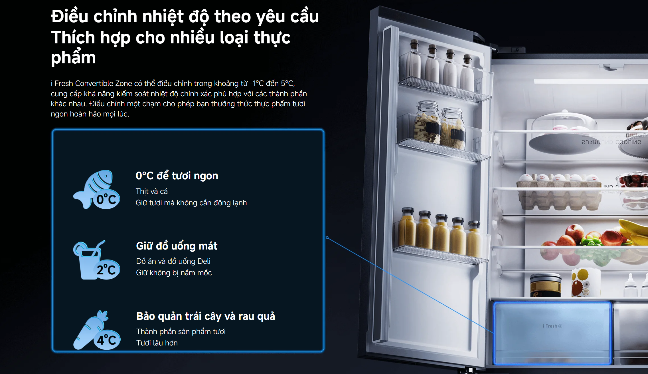 Khu vực chuyển đổi i Fresh có thể điều chỉnh nhiệt độ từ -1°C đến 5°C, rất linh hoạt cho việc bảo quản thịt, cá, đồ uống hoặc các loại rau quả tươi.