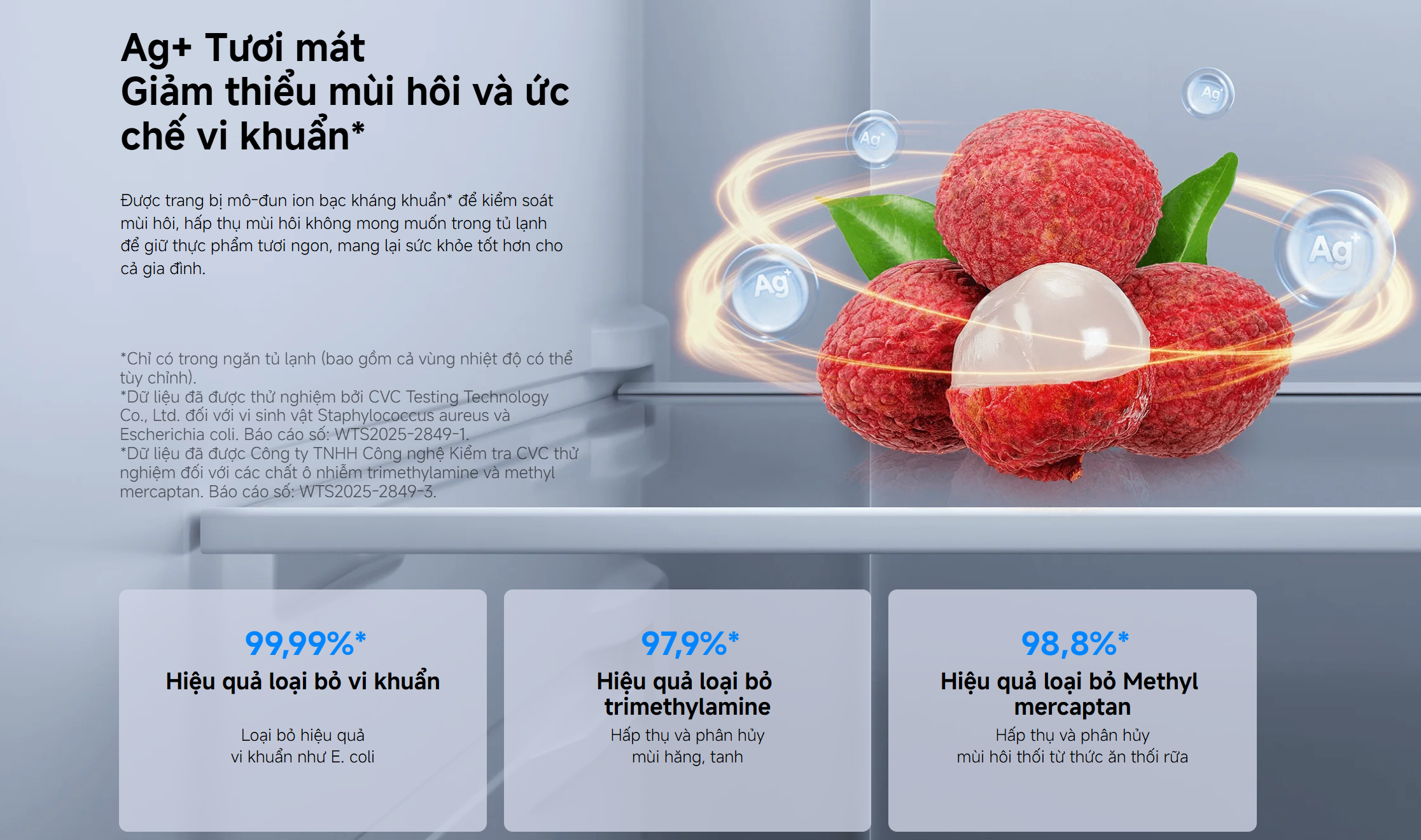 Bên cạnh đó, tủ lạnh còn có khả năng hấp thụ và phân hủy các hợp chất gây mùi khó chịu như trimethylamine (97,9%) và methyl mercaptan (98,8%) – những chất thường phát sinh từ thực phẩm hư hỏng hoặc có mùi tanh. Nhờ vậy, bạn có thể yên tâm bảo quản thực phẩm trong môi trường sạch sẽ và an toàn hơn cho sức khỏe.