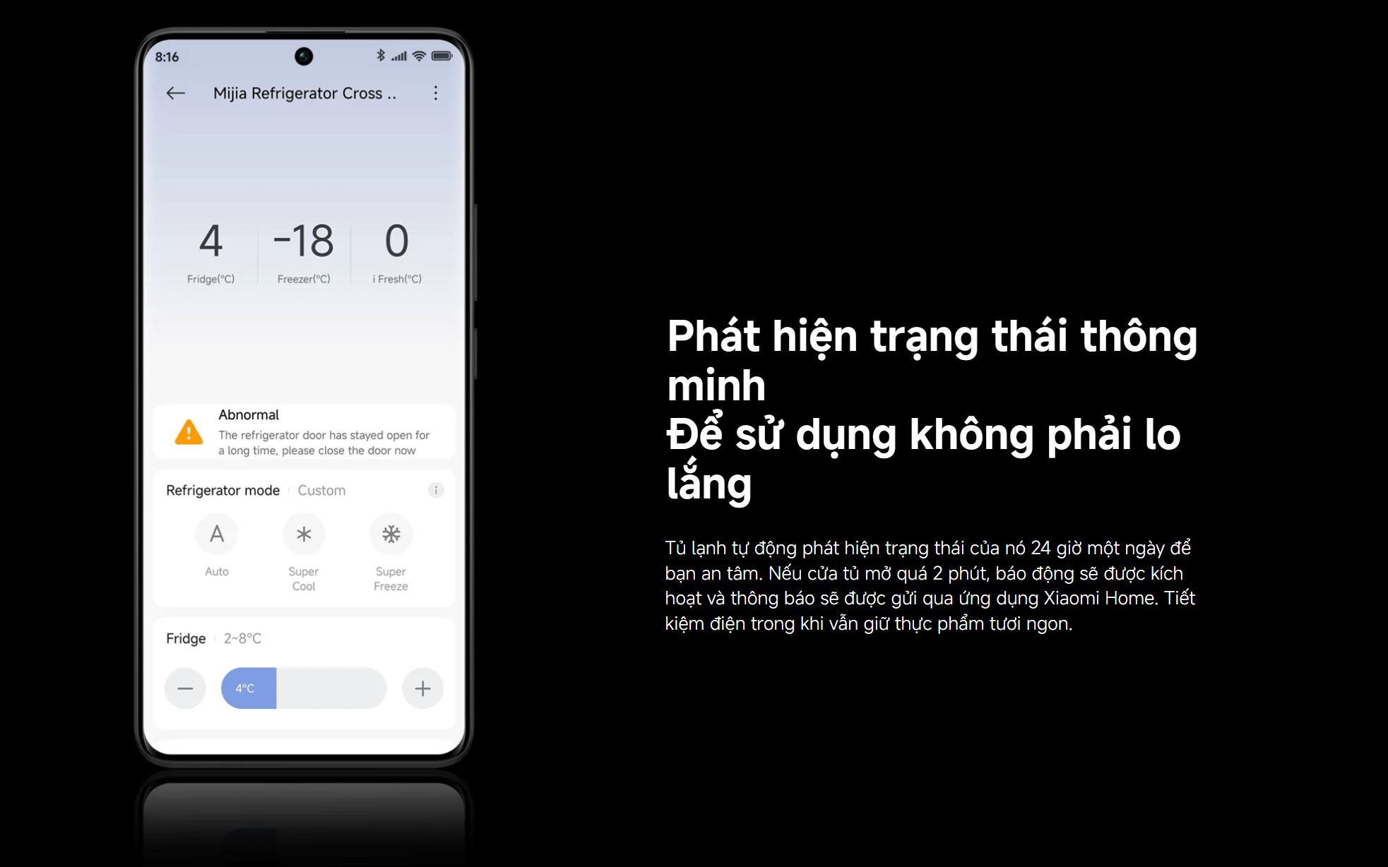 Hệ thống phát hiện trạng thái thông minh giúp bạn dễ dàng quản lý thiết bị. Nếu cửa tủ mở quá lâu, hệ thống sẽ phát tín hiệu cảnh báo và gửi thông báo qua ứng dụng. Ngoài ra, sản phẩm còn hỗ trợ cập nhật phần mềm