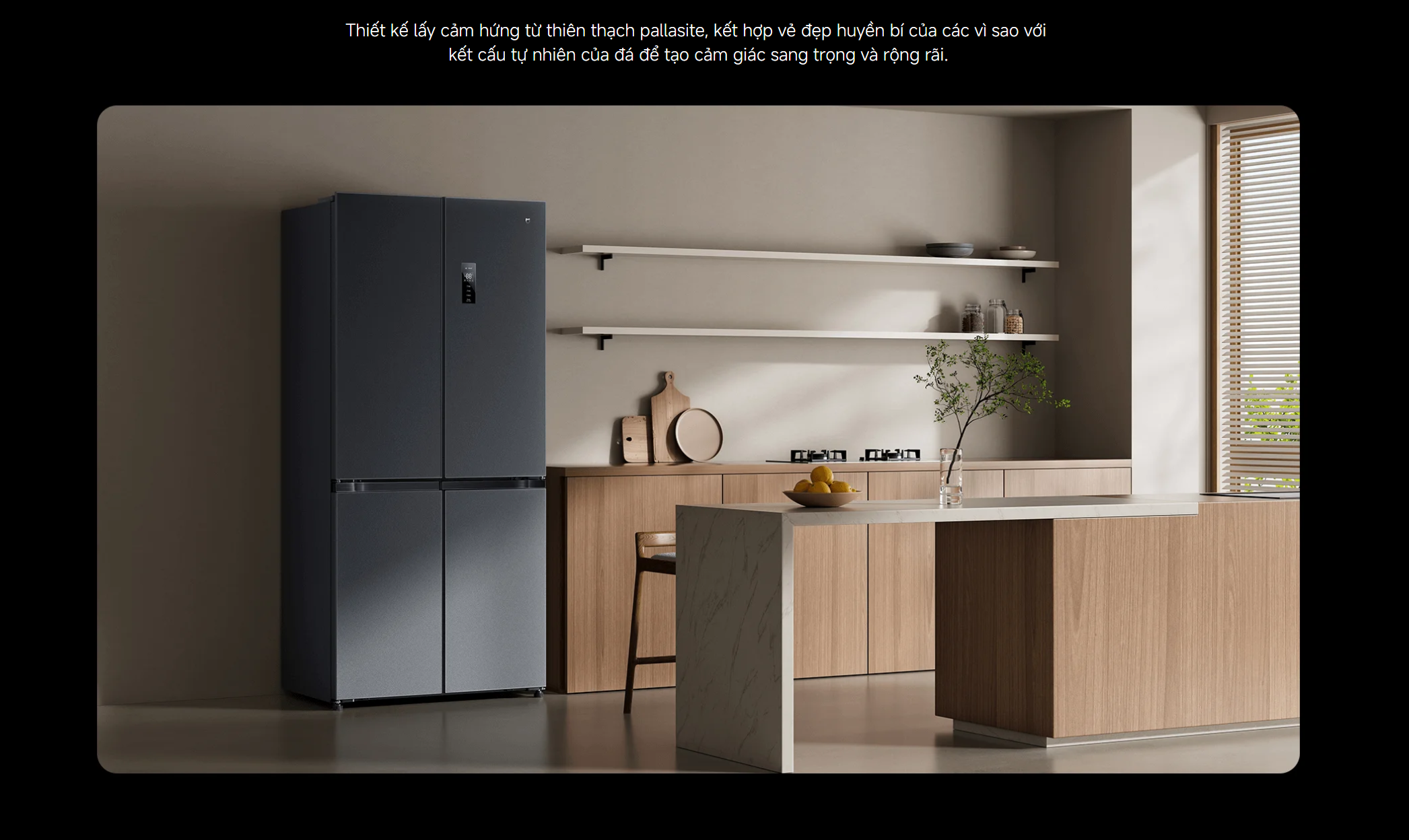 Bề mặt tủ lạnh được lấy cảm hứng từ kết cấu đá tự nhiên, kết hợp màu sắc nhã nhặn mang đến vẻ đẹp hài hòa, dễ phối hợp với nhiều phong cách nội thất khác nhau. Đây là một điểm cộng lớn cho những ai đang tìm kiếm sự đồng điệu giữa công năng và thẩm mỹ.