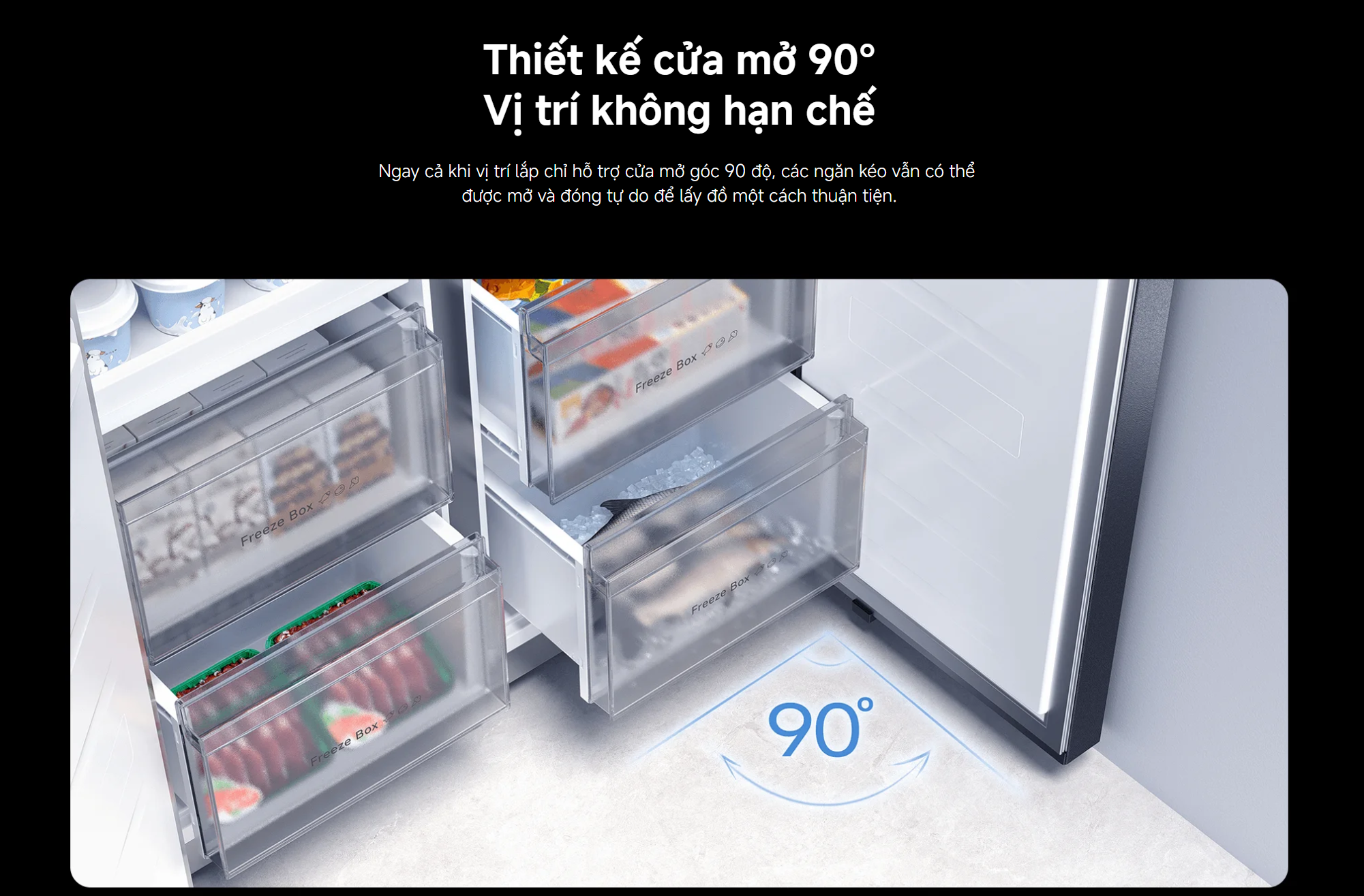 trong nhà mà không lo chiếm diện tích. Thiết kế cửa mở 90 độ giúp bạn mở ngăn kéo dễ dàng ngay cả khi tủ được đặt sát tường, phù hợp với nhiều kiểu bố trí nhà bếp hiện đại.