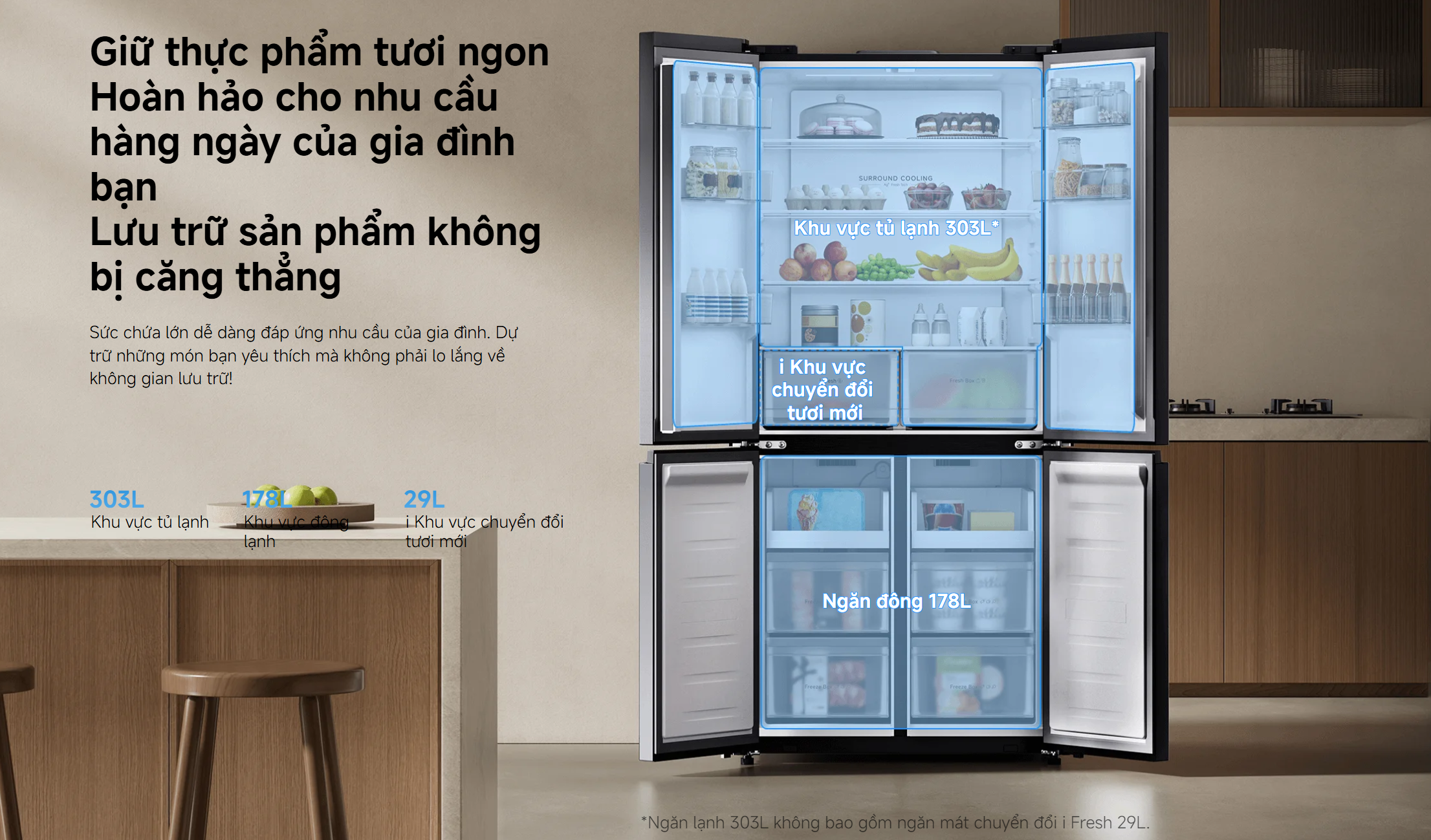 Với dung tích tổng cộng lên đến 510 lít, tủ lạnh Xiaomi Mijia hoàn toàn đáp ứng được nhu cầu bảo quản thực phẩm của gia đình từ 4 đến 6 người. Trong đó, ngăn lạnh chiếm 303L, ngăn đông 178L và khu vực chuyển đổi iFresh có dung tích 29L.
