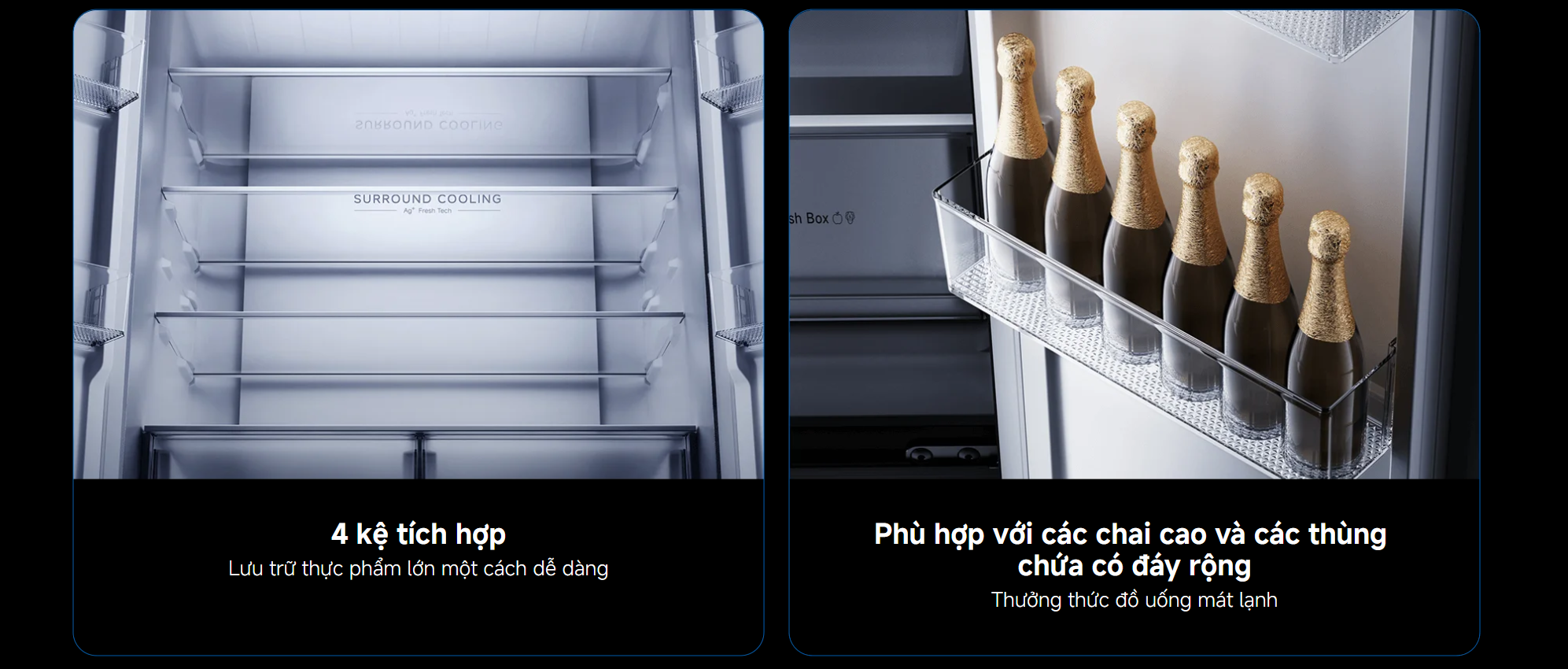 Bố cục các ngăn được sắp xếp khoa học và tiện lợi. 4 kệ tích hợp trong ngăn lạnh cho phép bạn lưu trữ các thực phẩm lớn hoặc chai lọ cao. Ngăn kéo chuyên dụng đựng trái cây và rau củ giúp duy trì độ tươi lâu hơn. Ngăn đông lớn đi kèm 2 khay và 4 ngăn kéo riêng biệt giúp phân chia thực phẩm sống - chín, dễ dàng sắp xếp và đảm bảo vệ sinh.