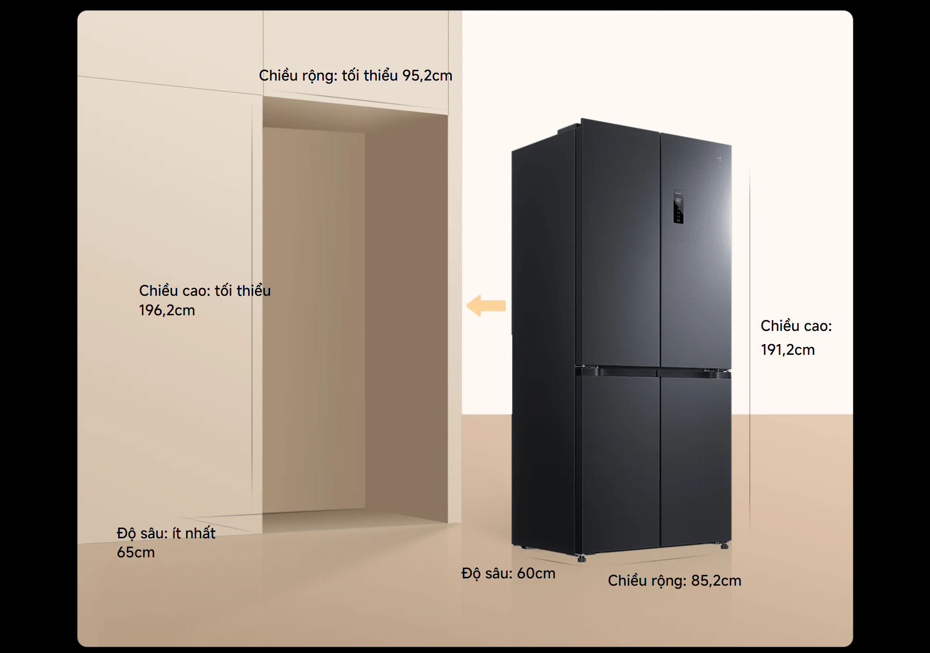 Xiaomi Mijia Cross Door 510L gây ấn tượng mạnh mẽ ngay từ cái nhìn đầu tiên nhờ thiết kế tối giản nhưng sang trọng. Với độ sâu chỉ 60cm, chiếc tủ lạnh này dễ dàng lắp đặt tại nhiều vị trí khác nhau