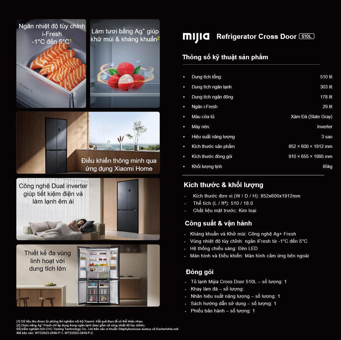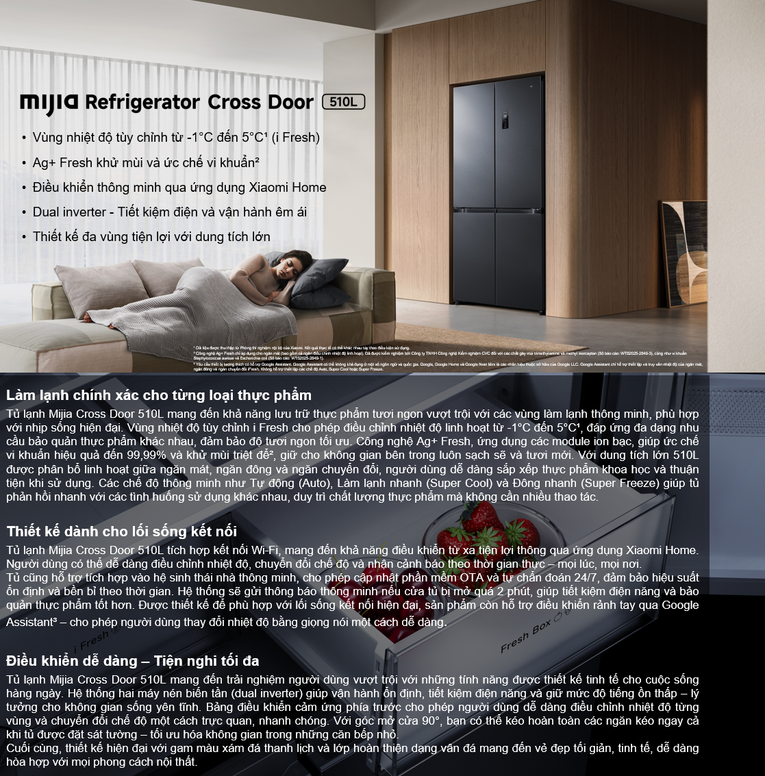 Tủ lạnh Xiaomi Mijia Refrigerator Cross Door 510L không chỉ là một thiết bị lưu trữ thực phẩm mà còn là sự kết hợp hoàn hảo giữa công nghệ tiên tiến, thiết kế tinh tế và khả năng vận hành thông minh. Sản phẩm phù hợp cho những gia đình hiện đại, yêu thích sự tiện nghi, tối ưu và an toàn cho sức khỏe.